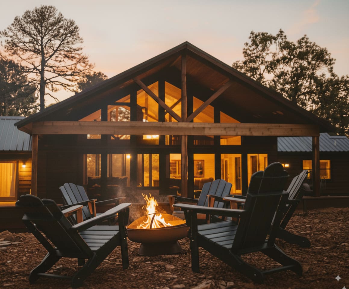 The cabin’s open concept plan offers a cozy space to unwind and relax