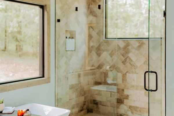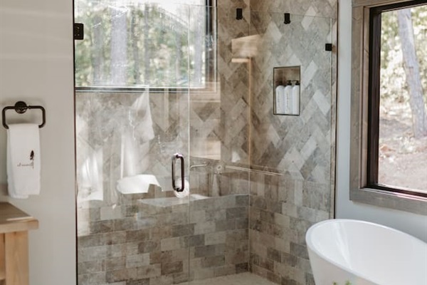 Let your worries wash away with our oversized rain showers and soak in tubs, while looking at the beautiful foliage around the cabin