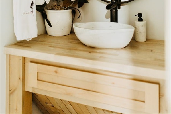 Beautifully decorated guest bathroom at our gorgeous cabin